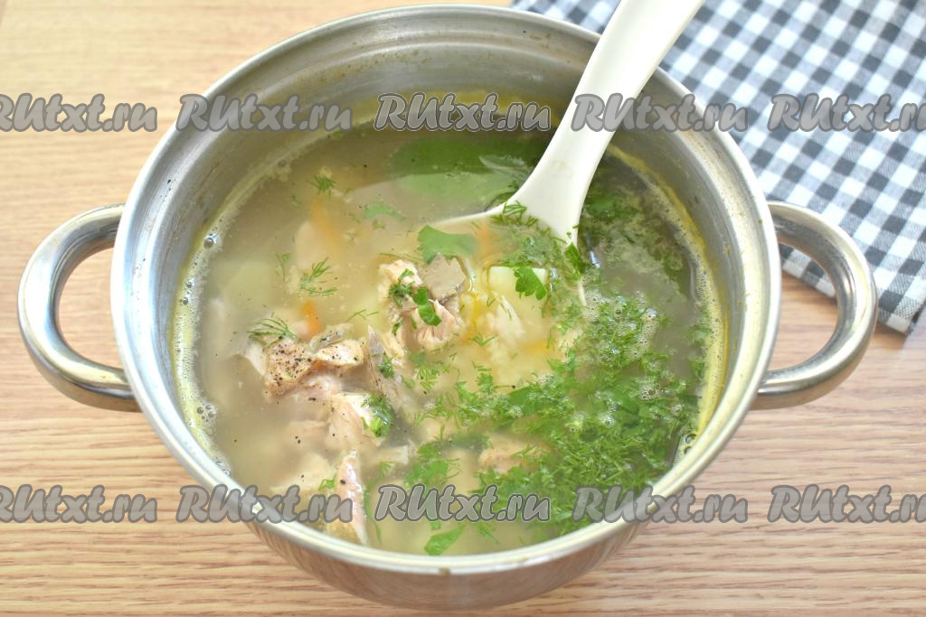 Затем перчим уху по вкусу, добавляем нарезанную зелень, перемешиваем и выключаем огонь.