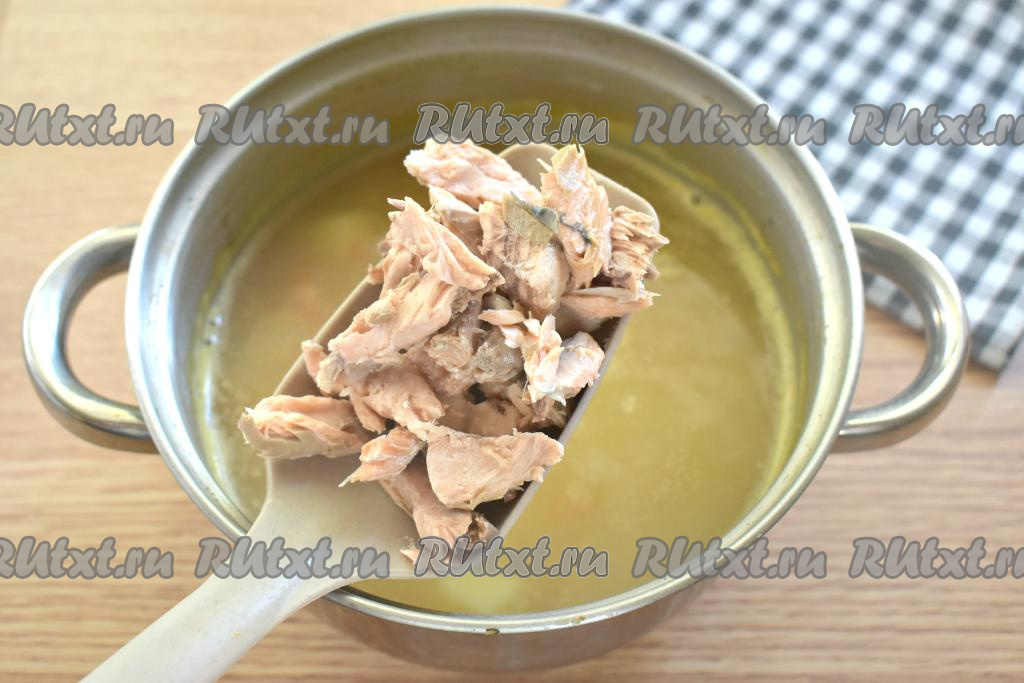 Варёную горбушу отделяем от костей, удаляем кожицу. После того как уха с пшеном проварится 20 минут, добавляем в кастрюлю лавровый лист и подготовленное филе горбуши, даём закипеть и варим на небольшом огне 3-4 минуты.
