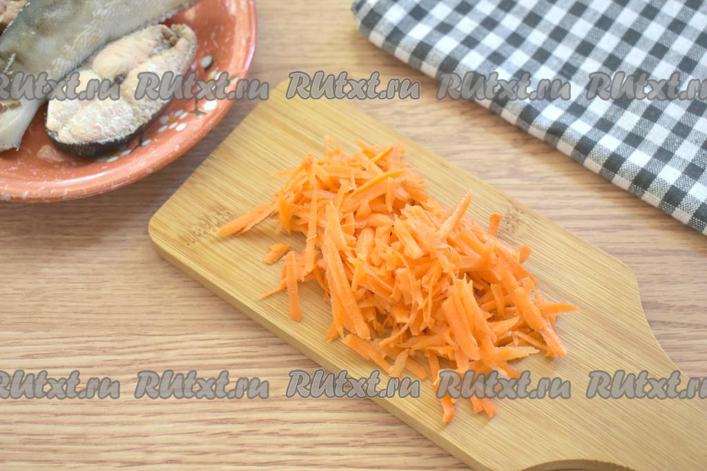 Очищенную морковку натираем на крупной тёрке и следом за картошкой отправляем в бульон.