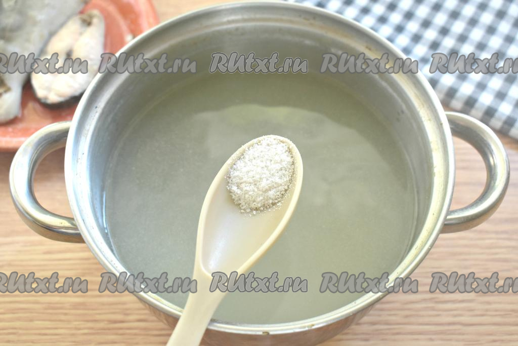 Для приготовления ухи из горбуши можно использовать любые части рыбы. Я взяла хвостовую часть. Кусочки выпотрошенной горбуши моем, кладём в кастрюлю, добавляем целую очищенную луковицу, вливаем 2 литра воды и ставим на сильный огонь. После закипания, убрав пену, варим горбушу на небольшом огне 25 минут.