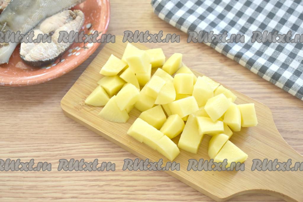 Кастрюлю с процеженным рыбным бульоном ставим на огонь. Картофель нарезаем на небольшие кубики, выкладываем в кипящий рыбный бульон.