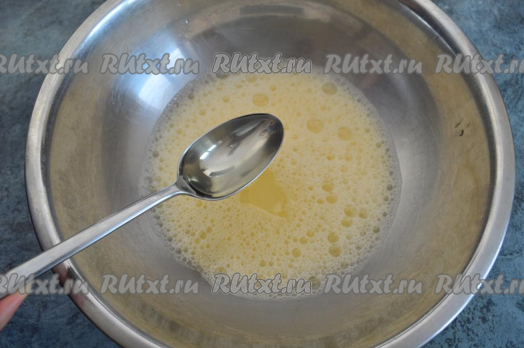 Вначале замесим тесто, для этого в миску нужно влить воду комнатной температуры, добавить соль и сырые яйца, взбить венчиком до однородности. Затем влить растительное масло, снова хорошо перемешать яичную смесь венчиком.