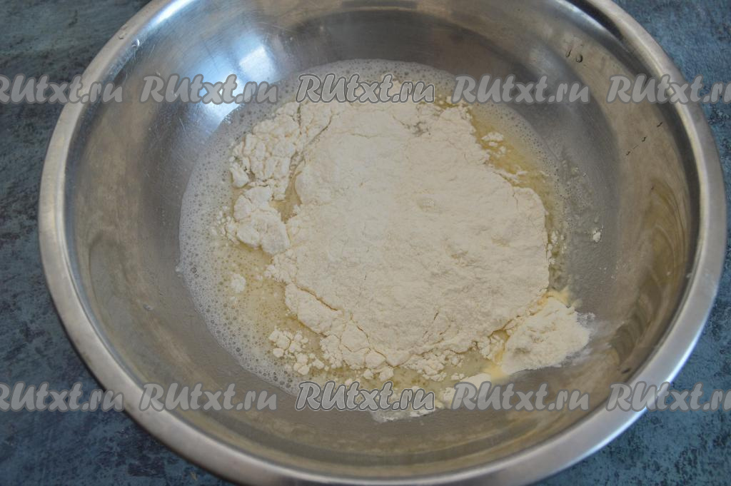 В получившуюся смесь всыпать половину муки, перемешать столовой ложкой. Затем частями начать добавлять оставшуюся муку, хорошо вмешивая её руками в пельменное тесто. Как только тесто перестанет липнуть к рукам, больше муку не добавляйте. Затем вымесить тесто в течение 2-3 минут.