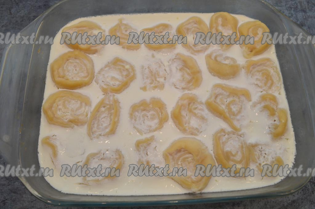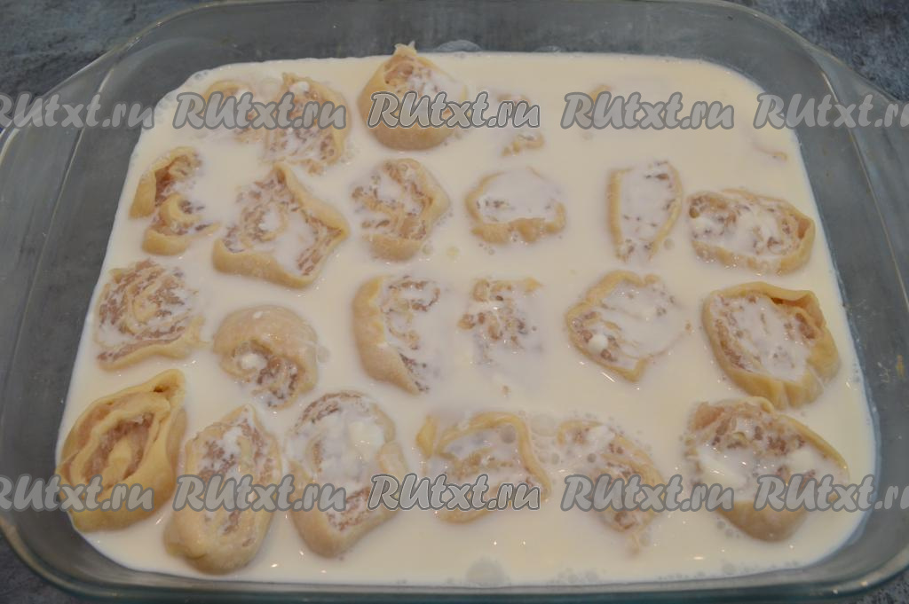 Накрыть форму фольгой и отправить ленивые пельмени в сметанном соусом в разогретую до 180 градусов духовку на 25 минут.