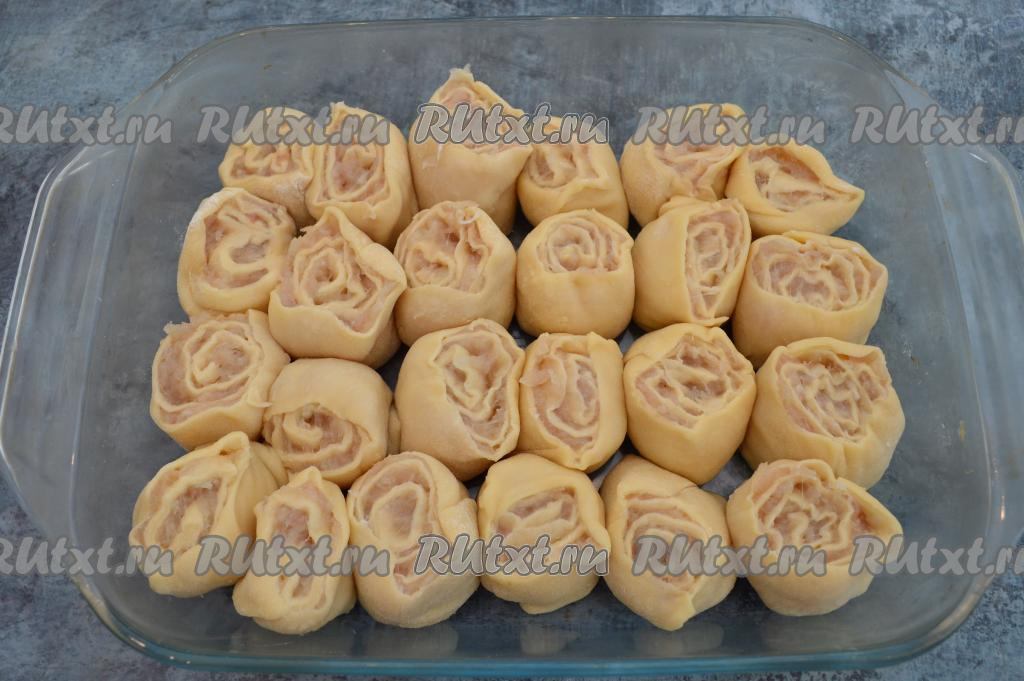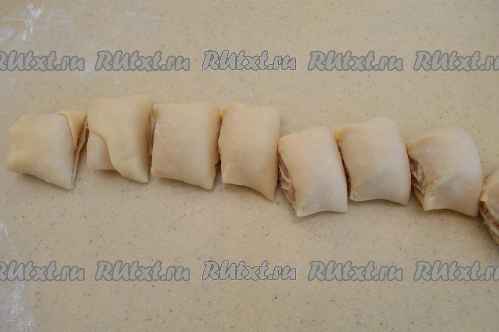 Скатать тесто в плотный рулет, начиная с широкой стороны.