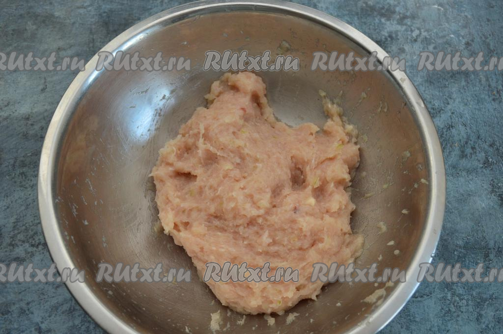 Пока тесто отдыхает, займёмся начинкой для ленивых пельменей. Вымытое и обсушенное мясо ( у меня - куриное филе) вместе с очищенными луковицами пропустить через мясорубку. Посолить получившийся фарш, добавить специи по вкусу и очень хорошо перемешать.
