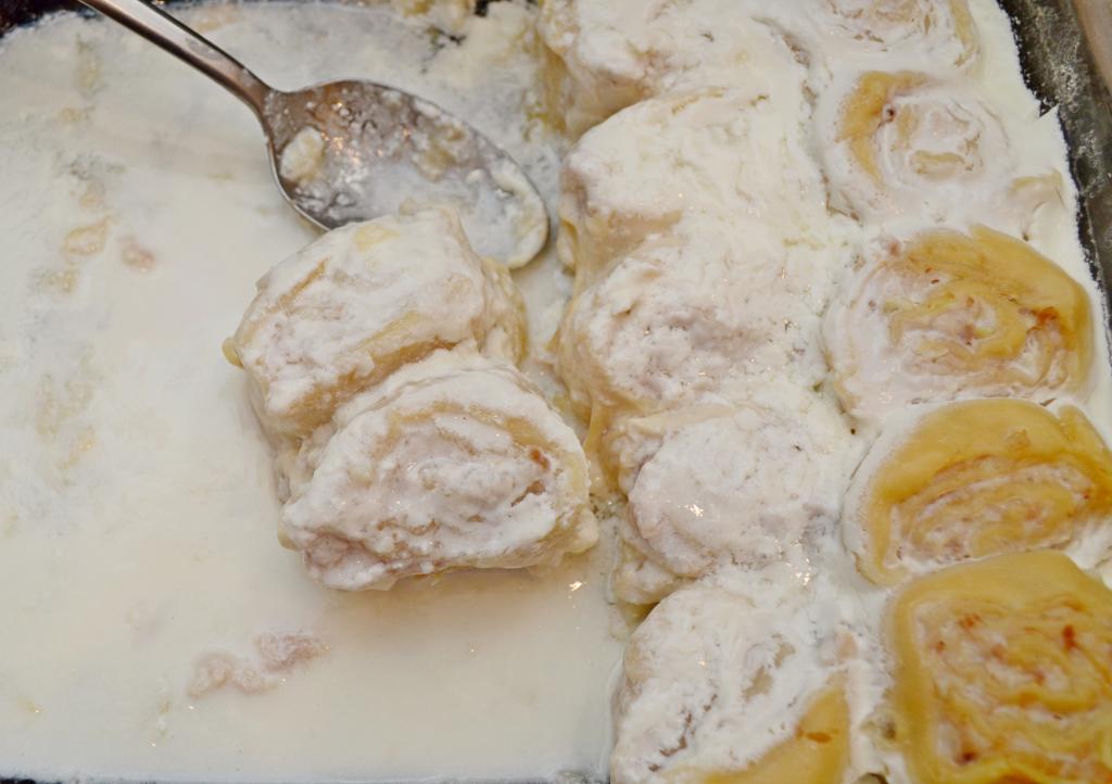 Вкусные, нежнейшие ленивые пельмени достать из духовки и сразу подать к столу вместе со сметанным соусом, в котором они запекались.