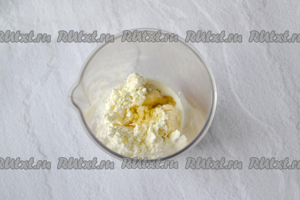 В чашу с бананом добавьте творог.