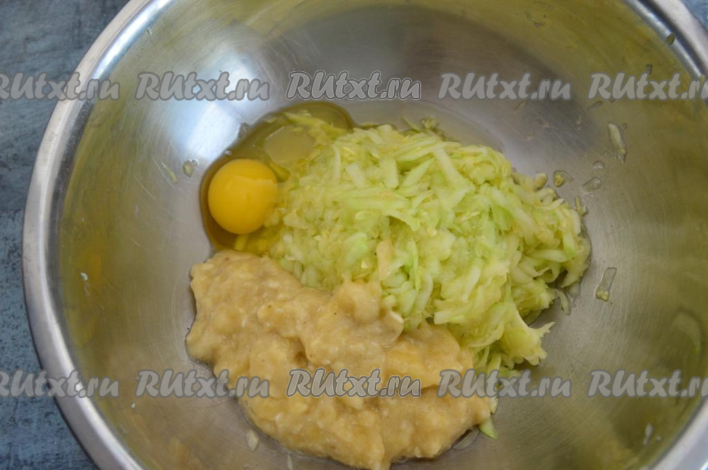 Затем руками отжать кабачковую массу от выделившегося сока. Отжатый сок нам не понадобится. В отжатом виде кабачок весил 365 грамм. В миску с отжатой кабачковой массой добавить банановое пюре и сырое яйцо.