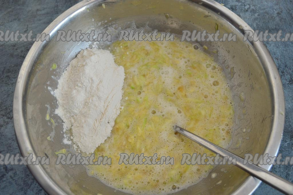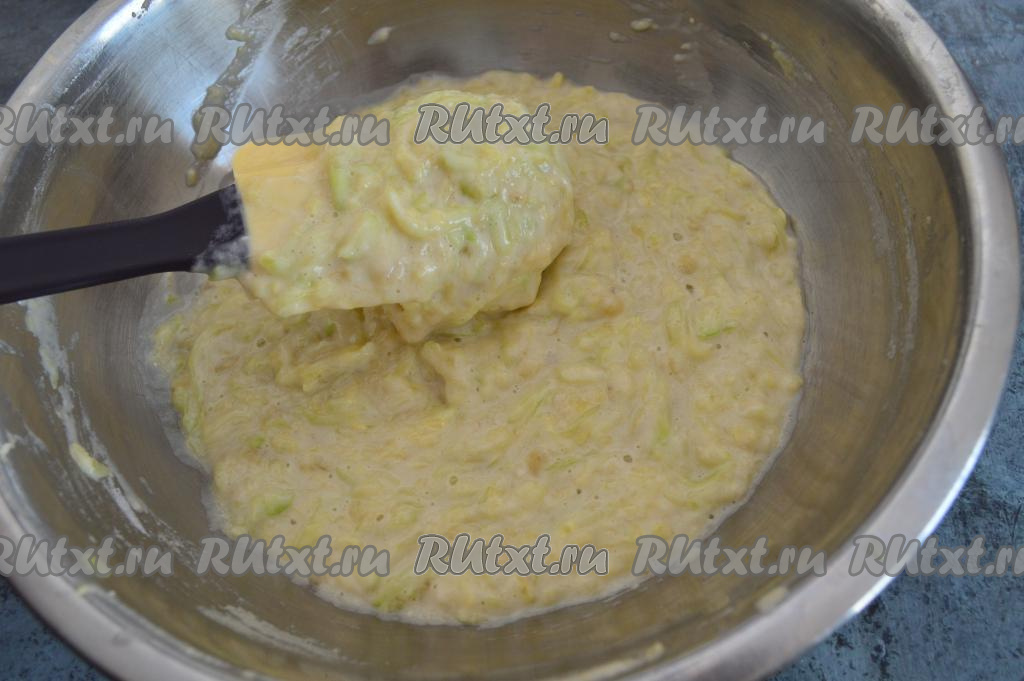 Затем начать по столовой ложке подсыпать ещё муку. Добавляя муку, учитывайте, что тесто для кабачково-банановых оладий должно получиться напоминающим в меру густую сметану. Тесто будет медленно стекать с лопатки. Мне для этого потребовалось 100 грамм муки, но тут всё зависит от влажности кабачково-банановой массы.