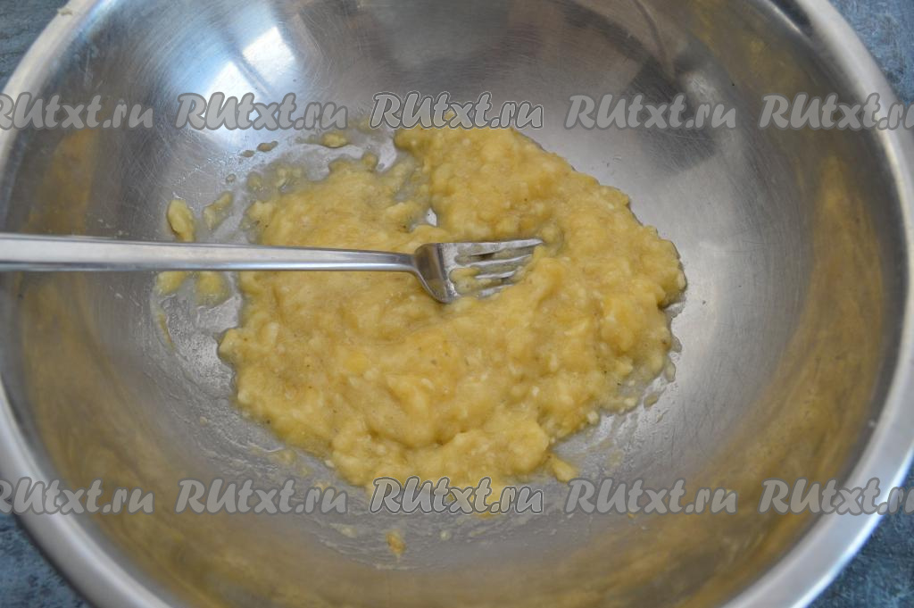 После того как кабачковая масса постоит 10 минут, можно заняться бананом. Очистить банан и вилкой размять в однородное пюре. Я взвесила пюре банана, вес составил 155 грамм.
