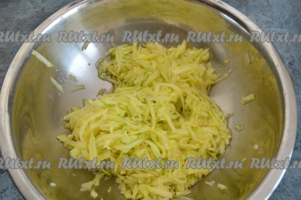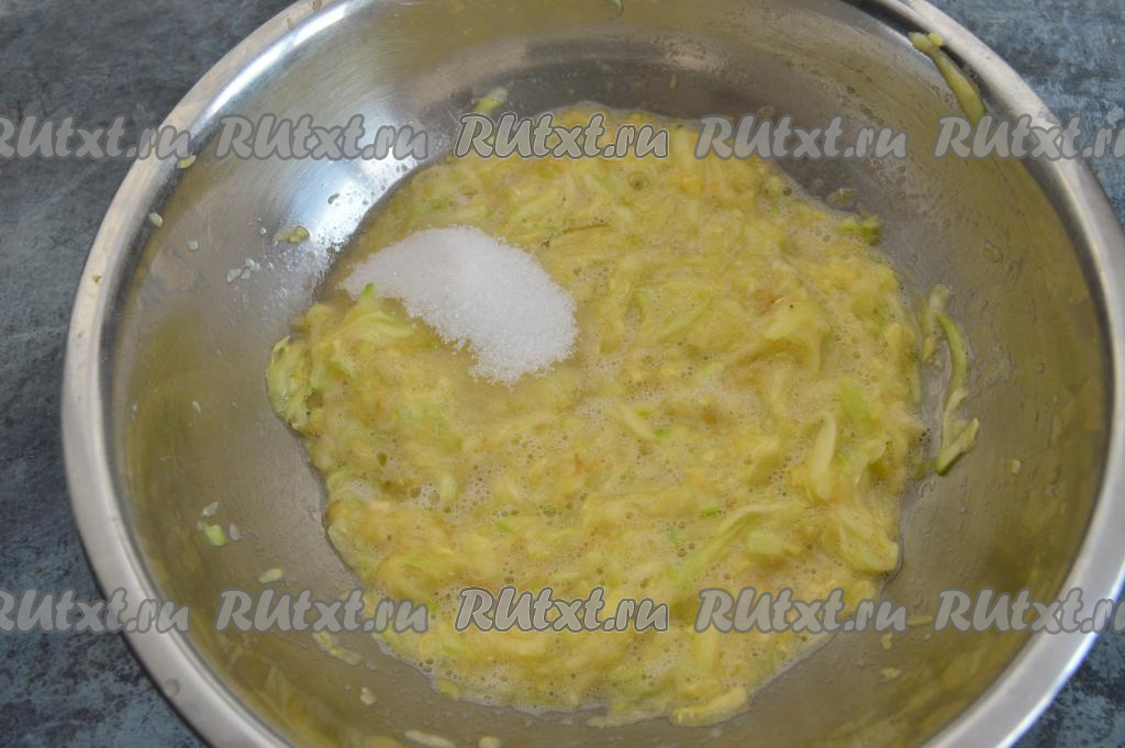 Кабачок очистить от кожуры. У меня был молодой кабачок с мелкими семечками. Если же вы взяли кабачок с крупными семенами, тогда обязательно удалите их. Натереть подготовленный кабачок на крупной тёрке. Я взвесила натёртый кабачок, вес составил 500 грамм. Всыпать к кабачку одну щепотку соли, перемешать и оставить на 10 минут, чтобы кабачок пустил сок.
