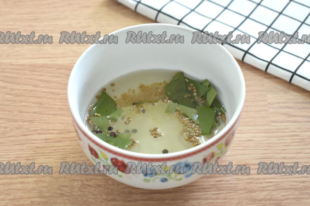 В отдельную небольшую миску всыпаем сахар, соль, зёрна горчицы и кориандра, горошины чёрного и душистого перцев, добавляем лавровые листья, разломанные на части.