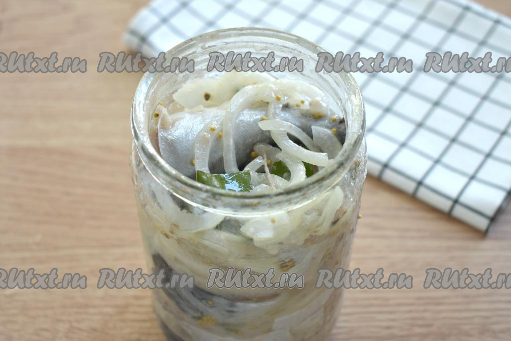 Кусочки скумбрии, покрытые смесью масла, лимонного сока и специй, поочерёдно с луком выкладываем в банку (я использовала стеклянную банку объёмом 0,7 литра). Остатки масляно-лимонной смеси тоже выливаем в банку. Накрываем банку со скумбрией крышкой и отправляем в холодильник на сутки.