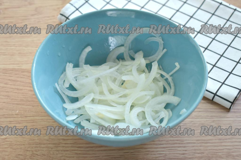 Очищенный лук нарезаем на тонкие полукольца, перекладываем в глубокую тарелку и жмём руками, чтобы лук дал немного сока.