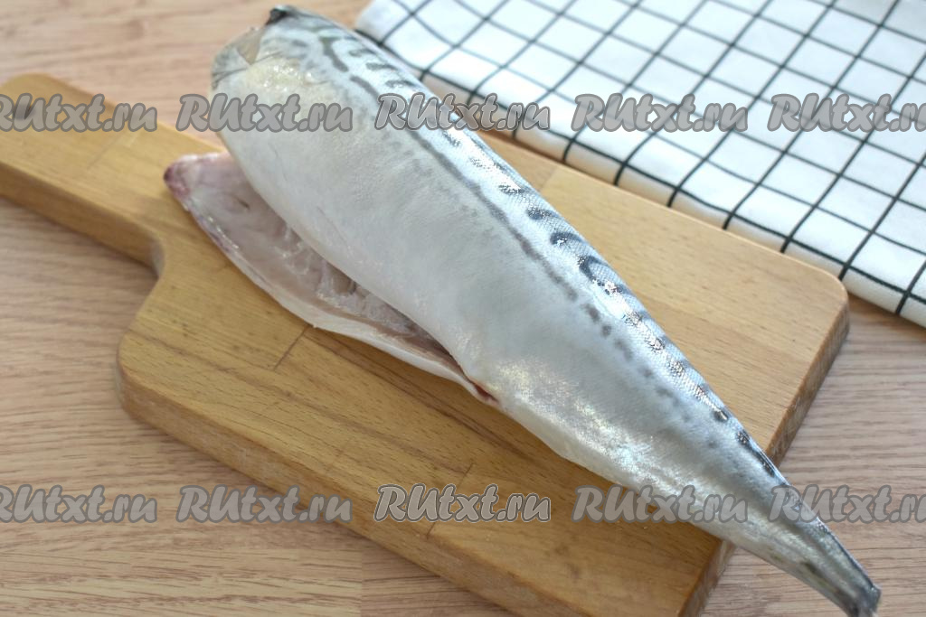 Замороженную скумбрию заранее достаём из морозилки и оставляем при комнатной температуре, чтобы рыба разморозилась. Можно разморозить скумбрию не до конца, чтобы её проще было очищать и потрошить. Отрезаем у рыбы голову, хвост и плавники. Удаляем из брюшка внутренности, обязательно избавляемся от чёрной плёночки, которая обычно горчит. Тщательно моем рыбу.