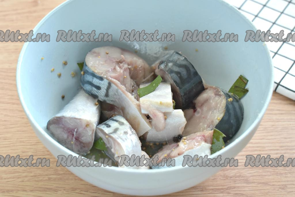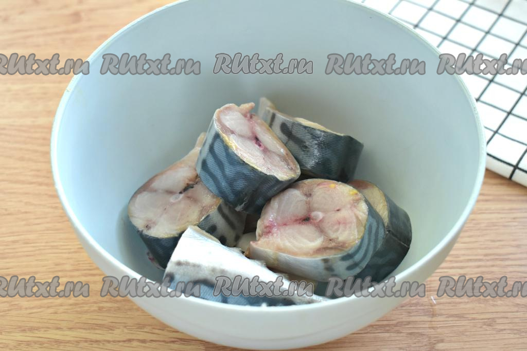 Подготовленную скумбрию нарезаем на кусочки толщиной примерно 2 сантиметра и складываем в миску.