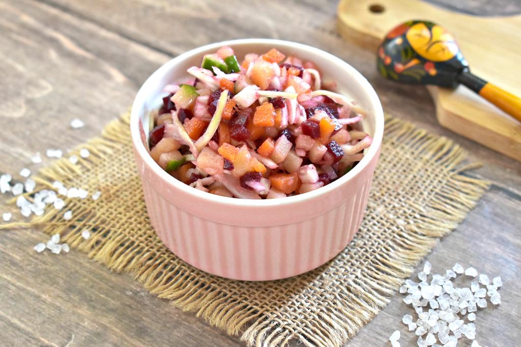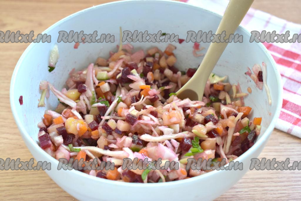 Перемешиваем и яркий, вкусный винегрет со свежим огурцом и свежей капустой готов.