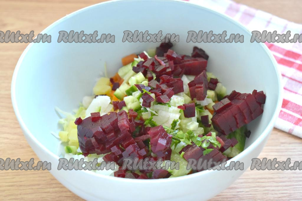 Очищаем свеклу, нарезаем её на кубики такого же размера, как нарезаны морковка, картошка и огурцы, затем перекладываем в миску.