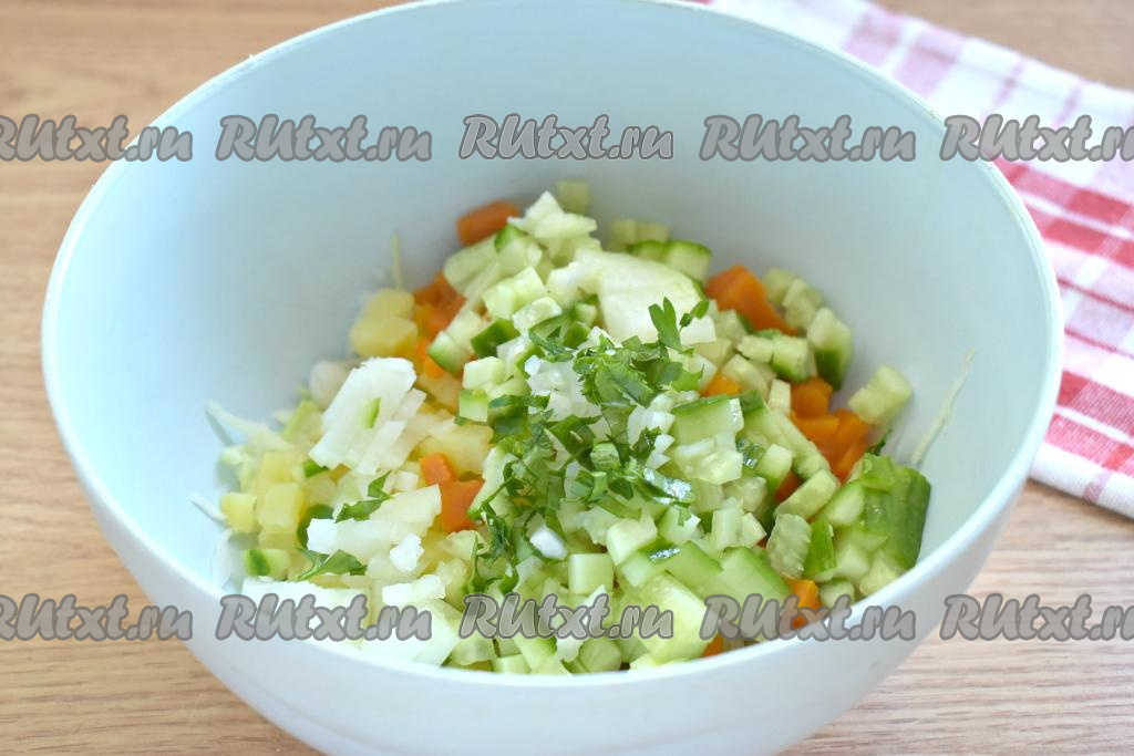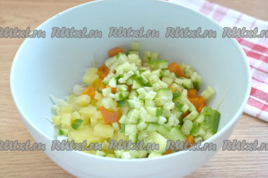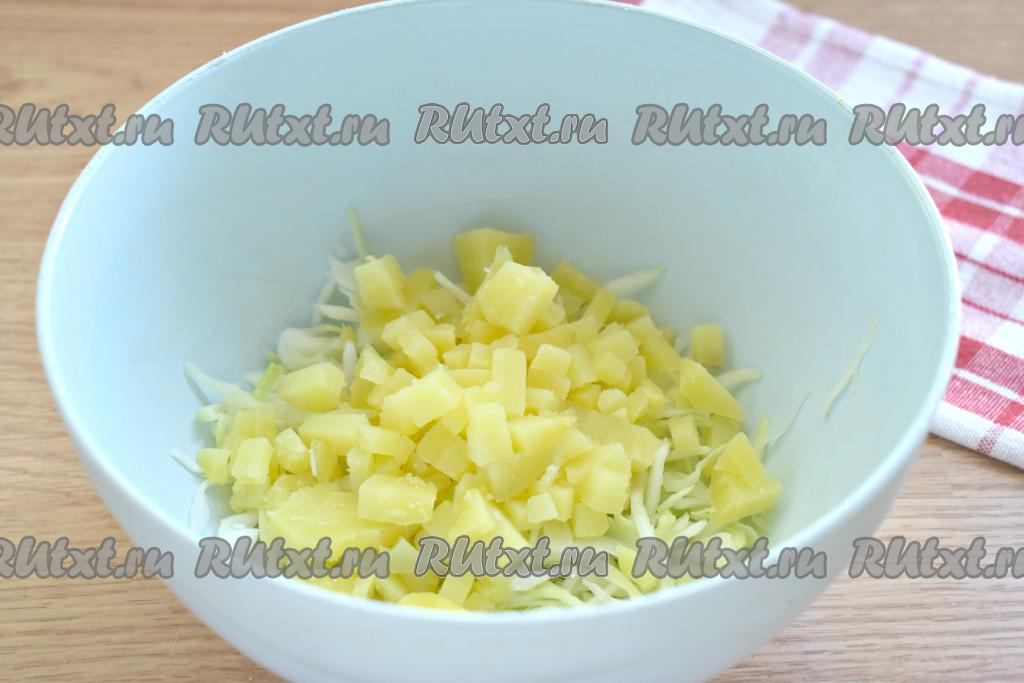 Очищаем варёную картошку, нарезаем на небольшие кубики и добавляем к капусте.
