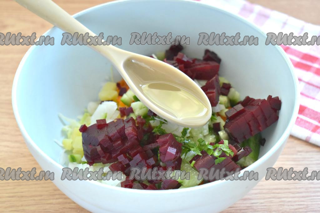 Заправляем винегрет растительным маслом, по вкусу его перчим, и, если нужно, то досаливаем.