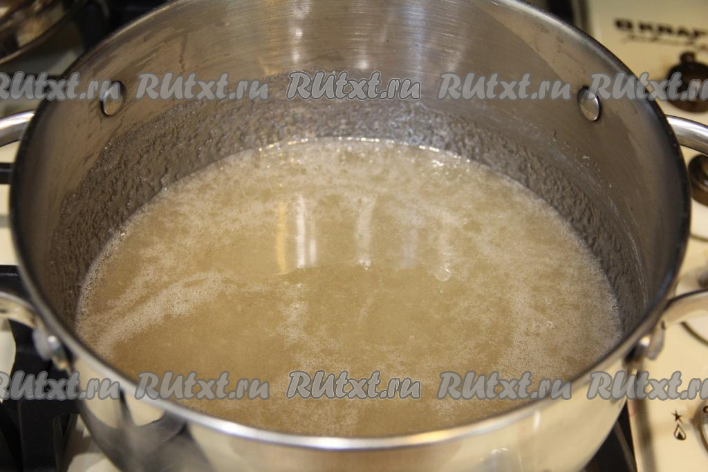 В кастрюлю всыпать сахар, влить воду, перемешать и поставить на достаточно сильный огонь.