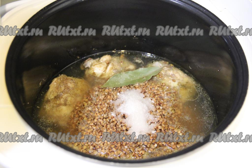 Гречку перебрать, промыть хорошо водой, дать стечь лишней жидкости. Всыпать подготовленную гречку в чашу мультиварки, добавить соль и лавровый лист, перемешать. Закрыть крышку и выставить на 35 минут режим "Плов".