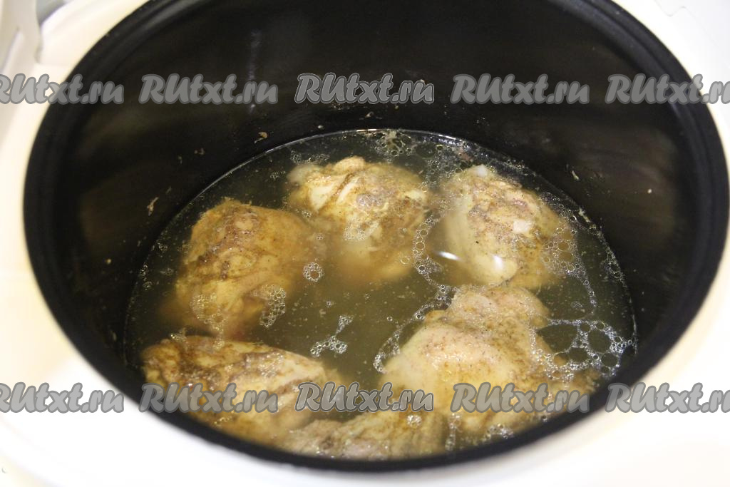 В чашу мультиварки выложить куриные бёдра, влить воду, закрыть крышку. Выставить режим "Тушение" на 30 минут.