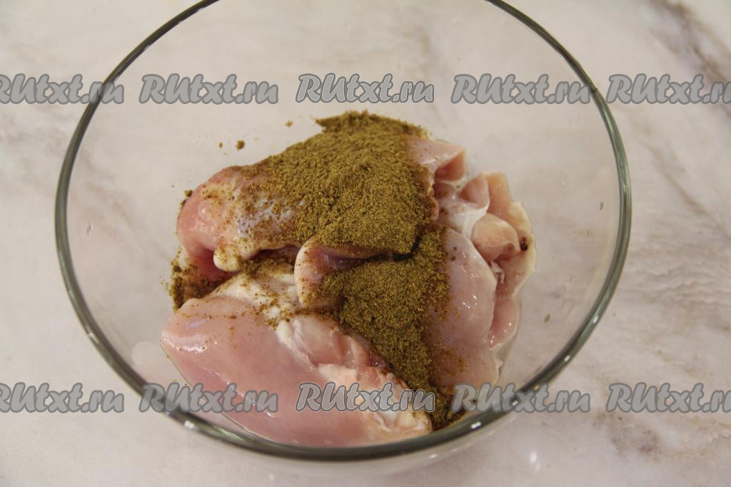 Куриные бёдра вымыть, по желанию, снять с них кожу. Выложить бёдра в миску, всыпать к ним специи, хорошо перемешать.