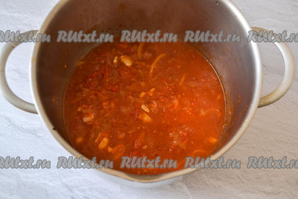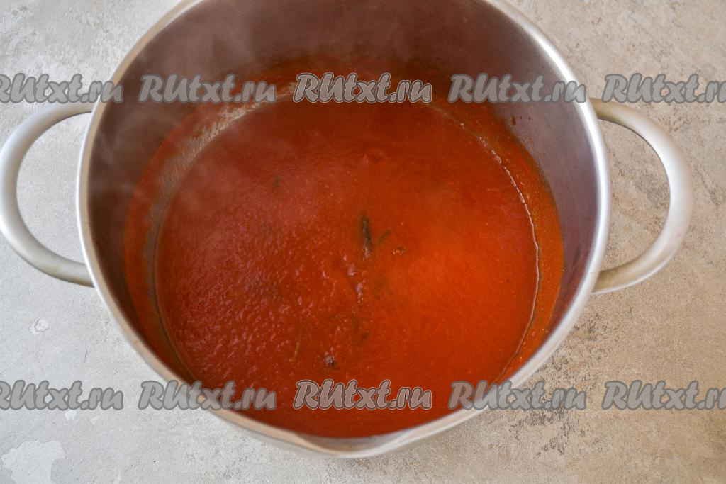 Перемешайте, доведите до кипения и варите томатную массу на минимальном огне, иногда перемешивая, 25-30 минут.
