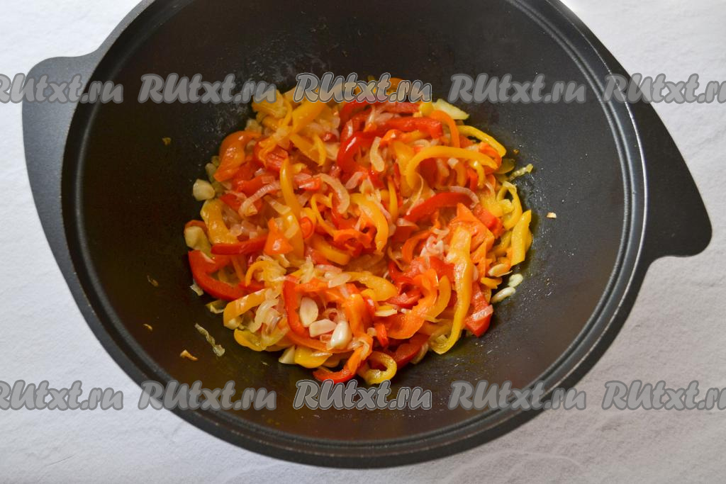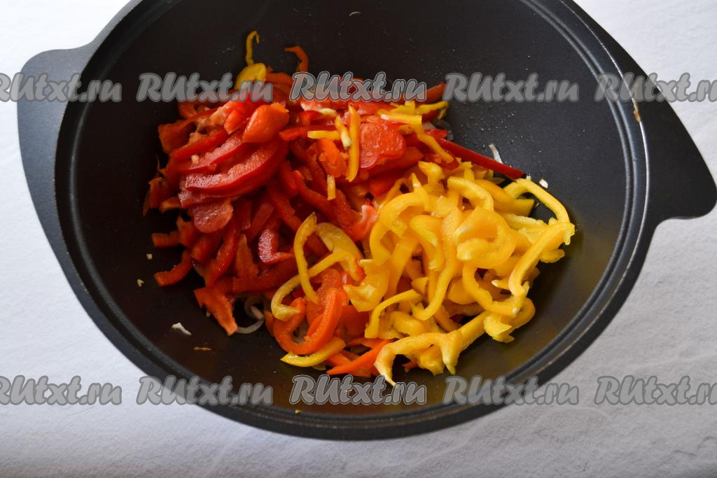 Болгарский перец разрежьте, удалите семена и плодоножки, промойте водой, а после этого нарежьте тонкой соломкой и выложите к луку, обжаренному с чесноком.