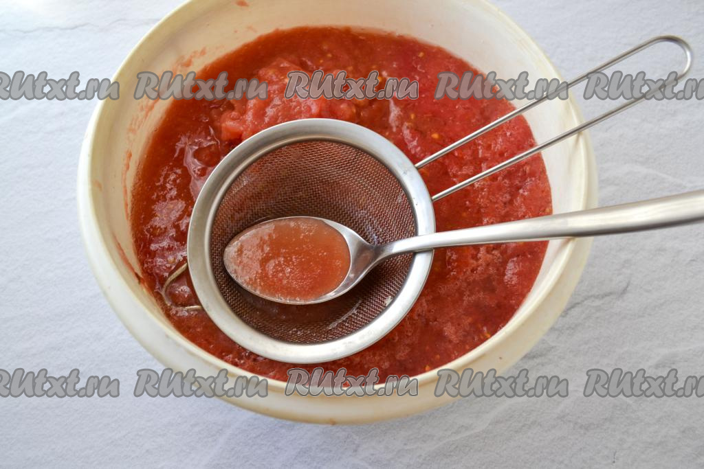 Из 2 килограммов измельчённых помидоров я постепенно отчерпала из сита 450 миллилитров томатного сока (для этого рецепта он нам не понадобится, этот сок можно просто выпить). Удаление лишнего сока нужно для того, чтобы сократить время варки соуса.