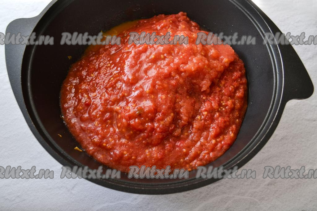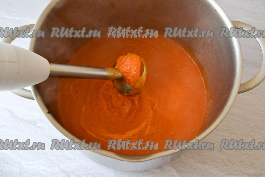 Снимите с огня, измельчите томатную массу погружным блендером до однородности.