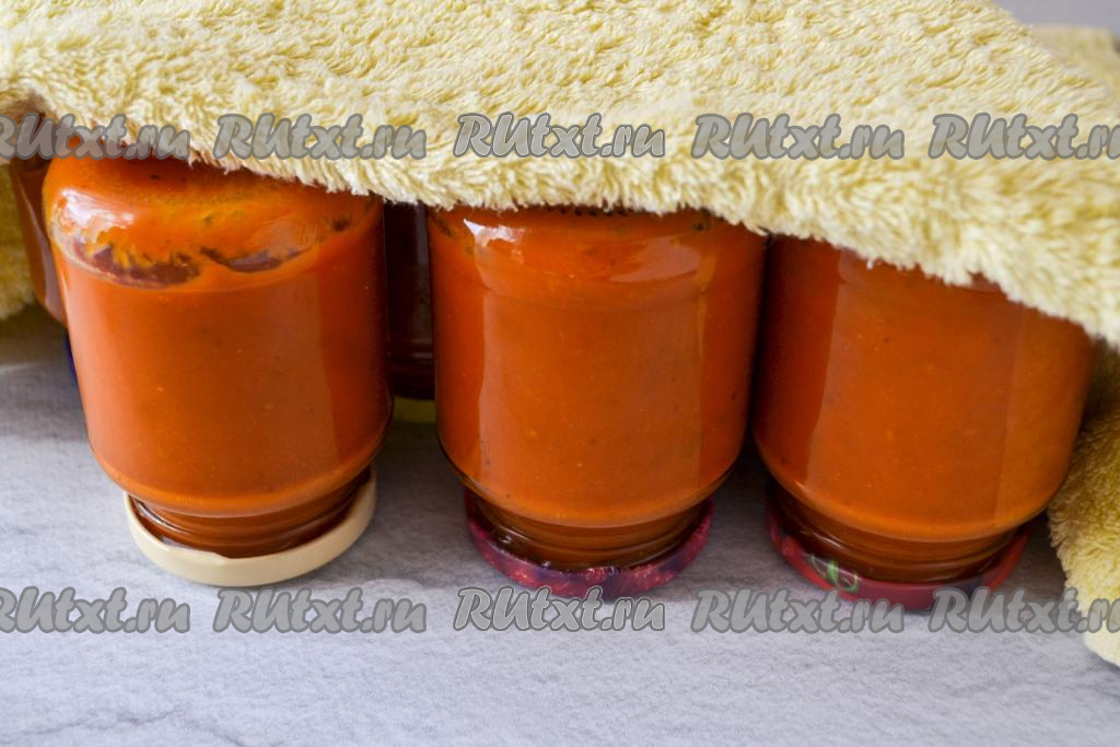 Баночки с соусом переверните вверх дном, укутайте в одеяло (или тёплое полотенце) и оставьте на сутки, а затем переставьте на хранение в прохладное место (например, в погреб или кладовку).