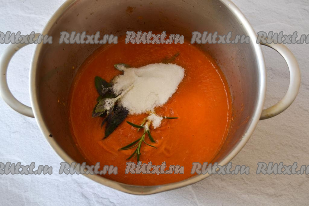 В кастрюлю с получившимся томатным соусом добавьте горошины чёрного перца, соль, сахар, веточки розмарина и базилика, поставьте на средний огонь.