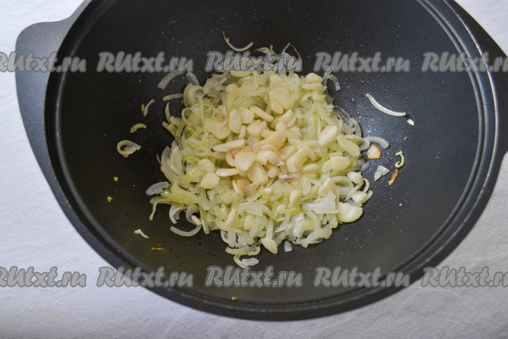 Обжарьте лук на среднем огне, иногда помешивая, до лёгкого золотистого цвета, затем добавьте нарезанный чеснок, перемешайте, обжаривайте 4-5 минут. Периодически перемешивайте овощи, чтобы они не подгорели.