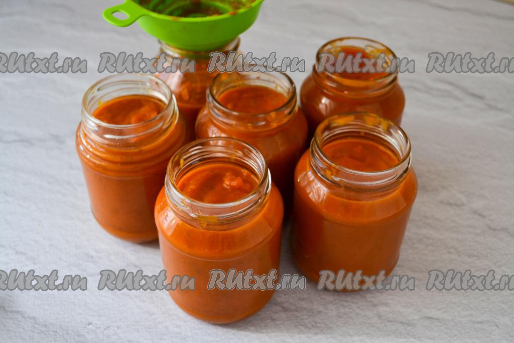 К этому времени уже должны быть вымыты с содой и простерилизованы любым удобным способом банки. Крышки тоже должны быть уже прокипячены в течение 4-5 минут с момента закипания воды. Разлейте горячий томатный соус в горячие баночки, закрутите сразу крышками. У меня получилось 1,4 литра соуса.