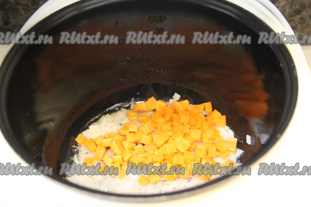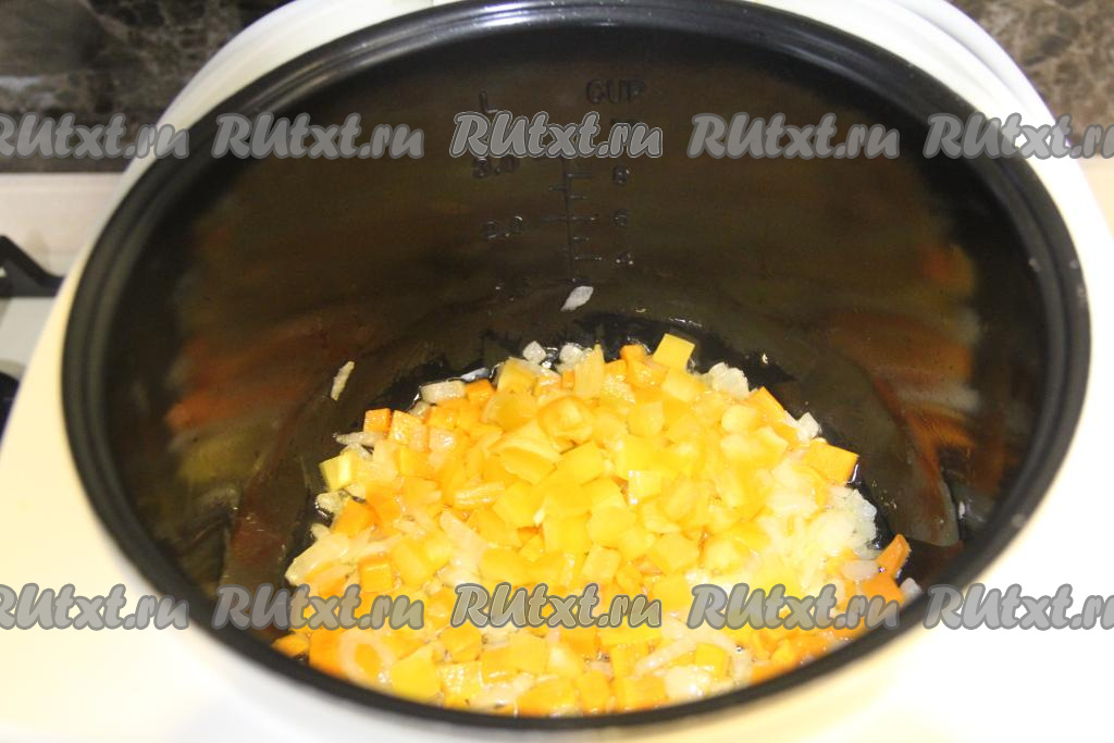Нарезанные морковь и перец выложить в чашу мультиварки.