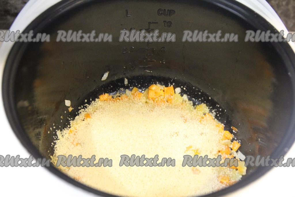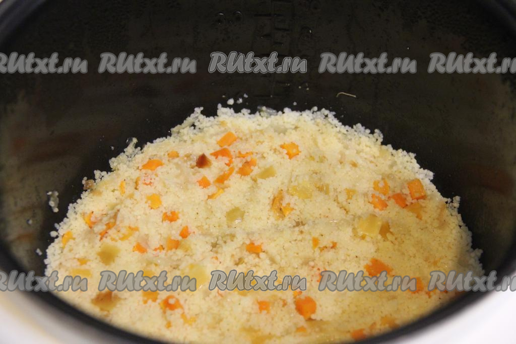 Когда обжаренные овощи станут достаточно мягкими, всыпать к ним кускус.