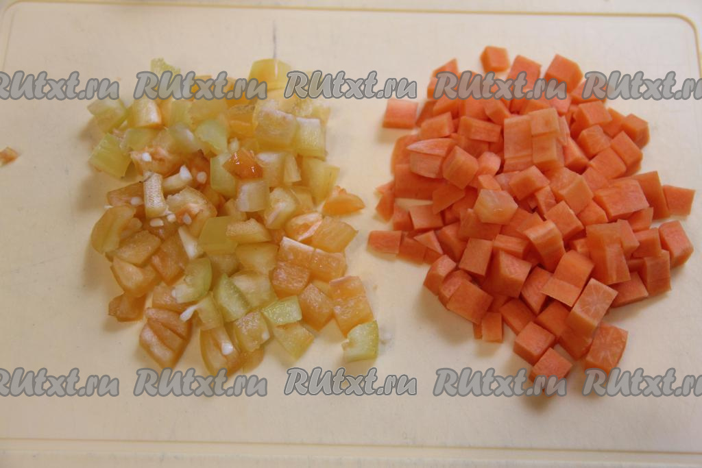 Морковь и болгарский перец нарезать на мелкие кубики.