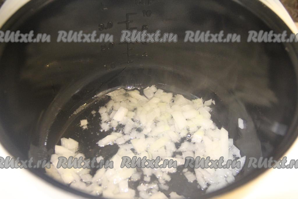 В чашу мультиварки влить растительное масло, выставить режим "Жарка". Лук мелко нарезать, выложить в чашу и обжаривать его 2-3 минуты (до прозрачности), не закрывая крышку мультиварки и периодически перемешивая.