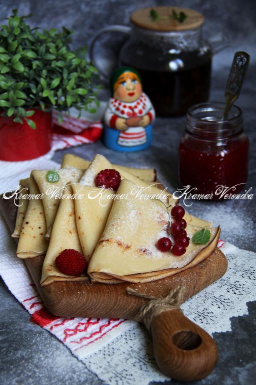 Блинчики готовлю часто и по разным рецептам. В этот раз решила приготовить тонкие, нежные блины из теста, замешанного на горячей воде с яйцами без добавления молока и кефира. Блинчики получились эластичными, вкусными. В процессе жарки я не смазывала сковороду маслом, блины не прилипают и прекрасно переворачиваются. К столу эти блинчики можно подать со сметаной, вареньем или мёдом.