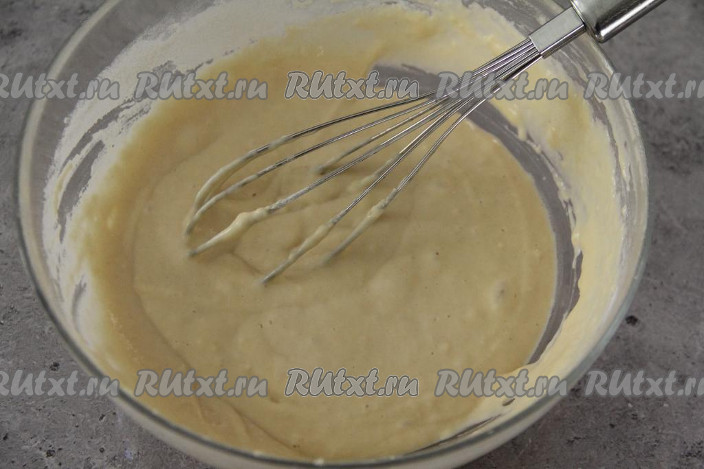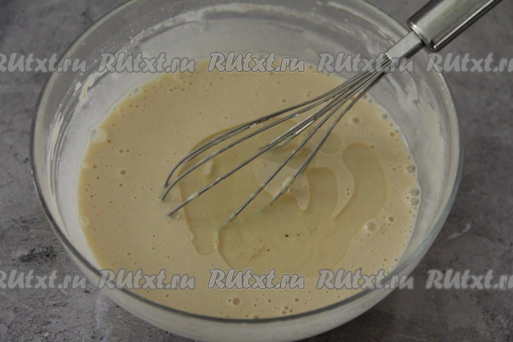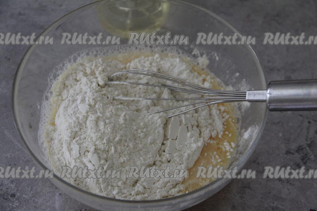 Влить растительное масло, перемешать. Тесто получится не густым, но и очень жидким оно быть не должно.