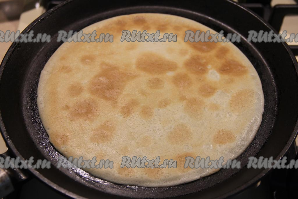 Скороду хорошо разогреть. Маслом я сковородку не смазывала, но многое безусловно зависит от качества покрытия сковороды. Если не уверены в качестве покрытия сковородки, тогда перед жаркой первого блина слегка смажьте её маслом. Влить половник теста в раскалившуюся сковороду. Равномерно распределить блинное тесто по сковороде. Жарить блин на среднем огне до подрумянивания снизу, затем перевернуть на другую сторону (несмотря на то что блинчик достаточно тонкий, переворачивается он хорошо).