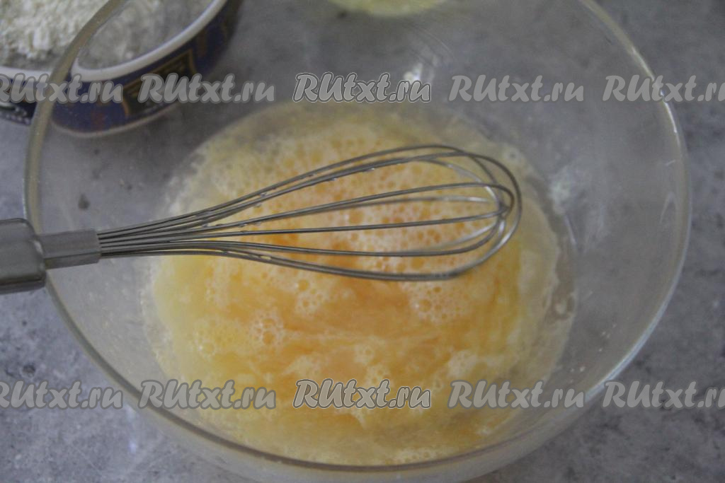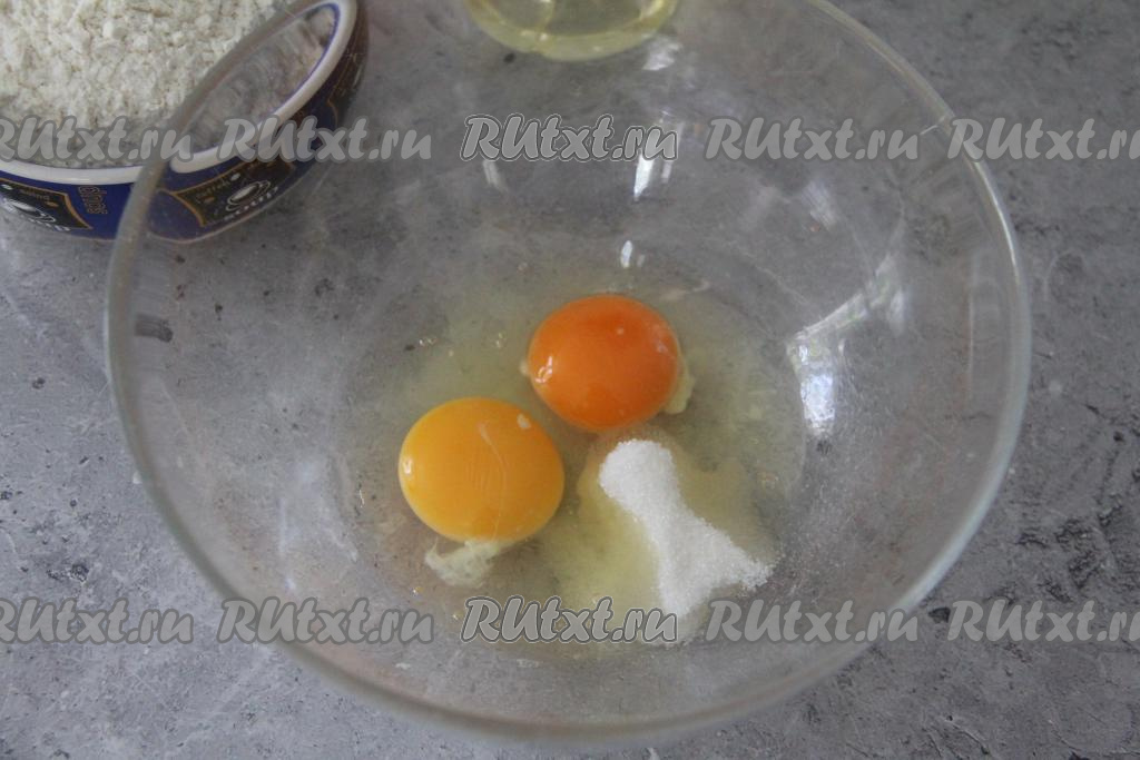 Соединить в достаточно глубокой миске яйца, сахар и соль, взбить хорошо венчиком.