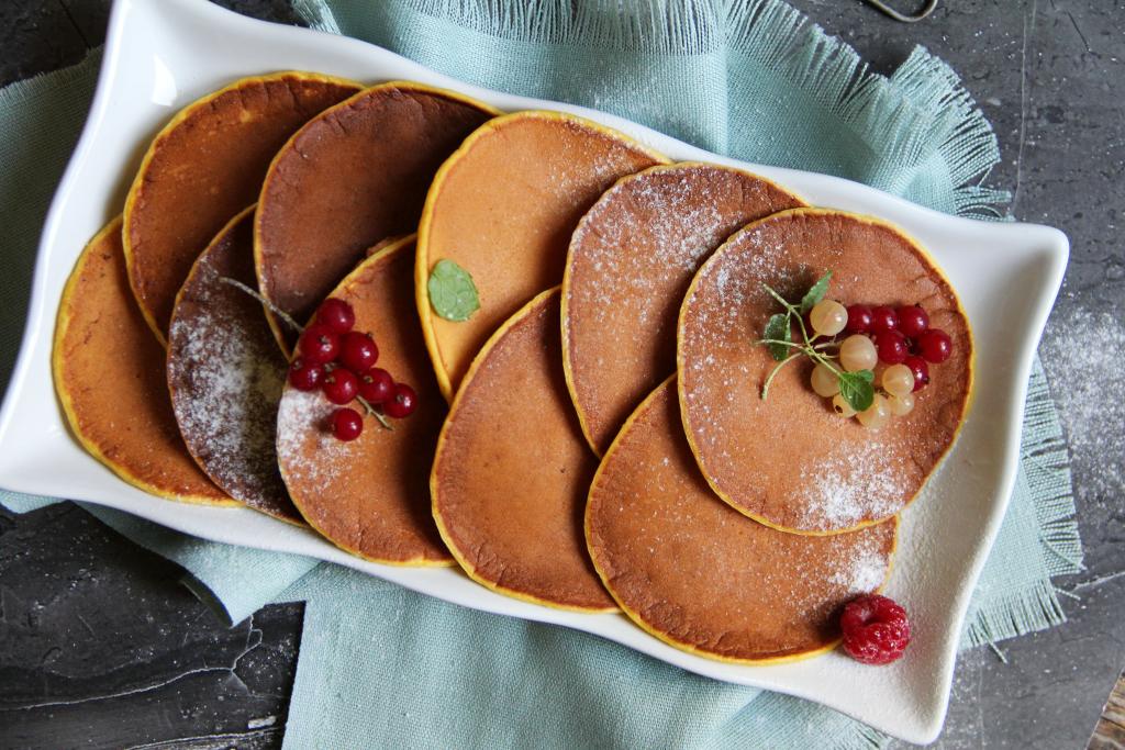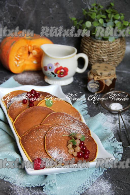 Яркие, вкусные тыквенные панкейки подать к столу, дополнив сметаной, растопленным сливочным маслом или джемом.