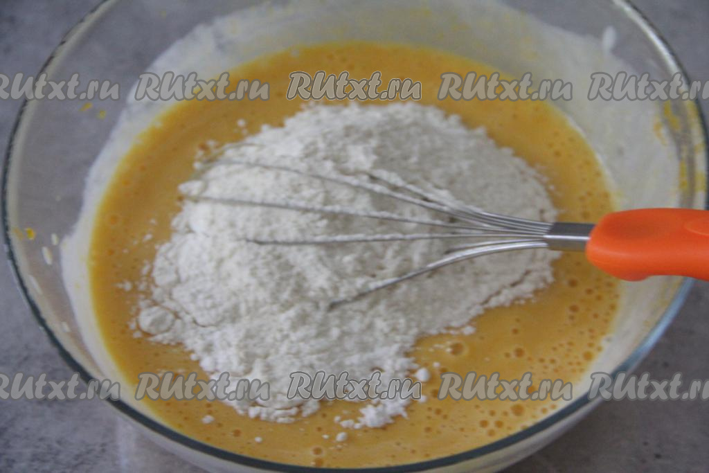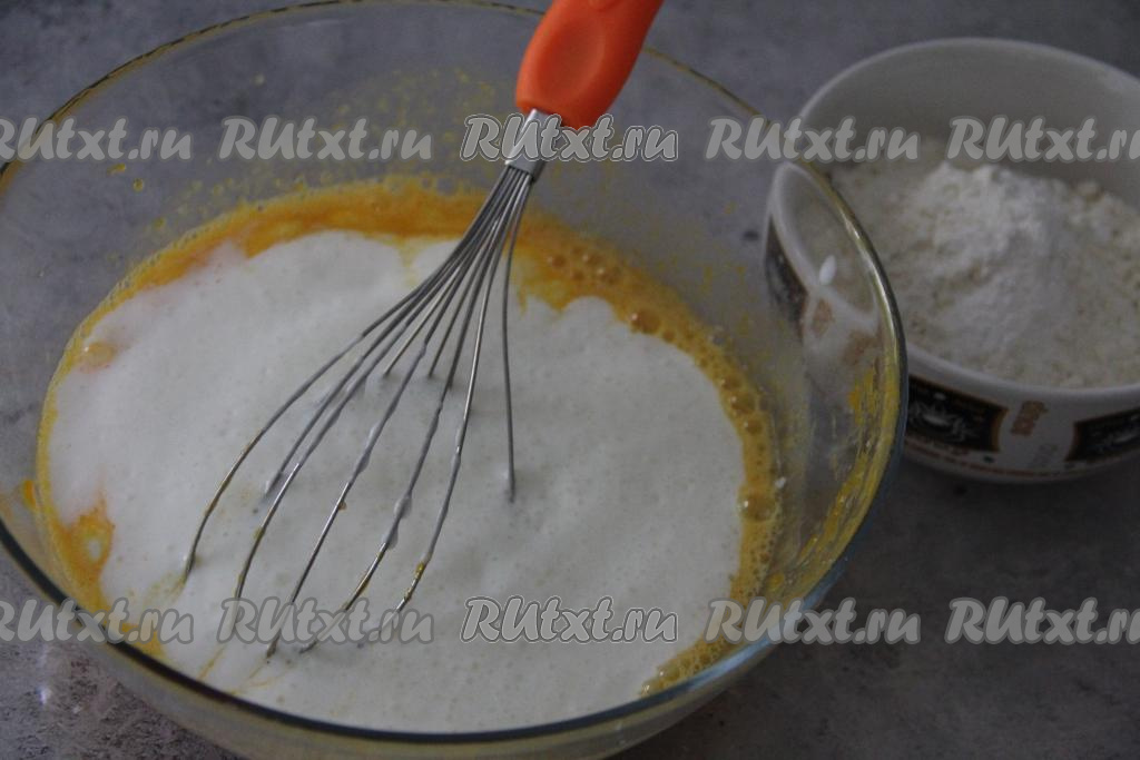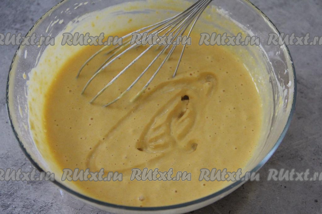 Всыпать муку, перемешать тыквенное тесто венчиком до однородности.