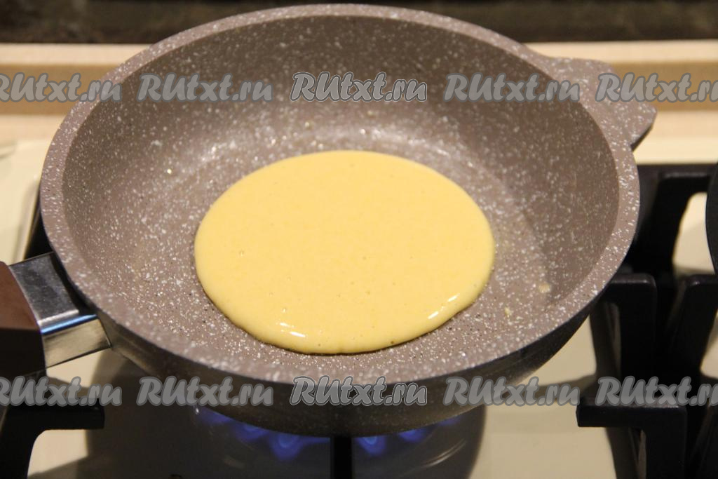 На хорошо разогревшуюся сухую сковороду влить 1,5-2 столовых ложки теста. В отличие от оладий панкейки жарятся на сухой сковороде, но если качество покрытия сковороды не очень хорошее, можете её совсем немножко смазать растительным маслом. Выпекать тыквенный панкейк с двух сторон до золотистого цвета на среднем огне, затем переложить на тарелку.