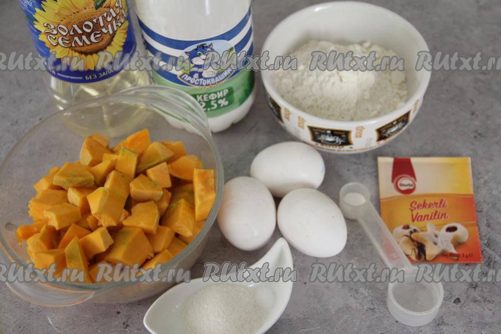 В миску с тыквенно-яичной смесью влить кефир, перемешать.