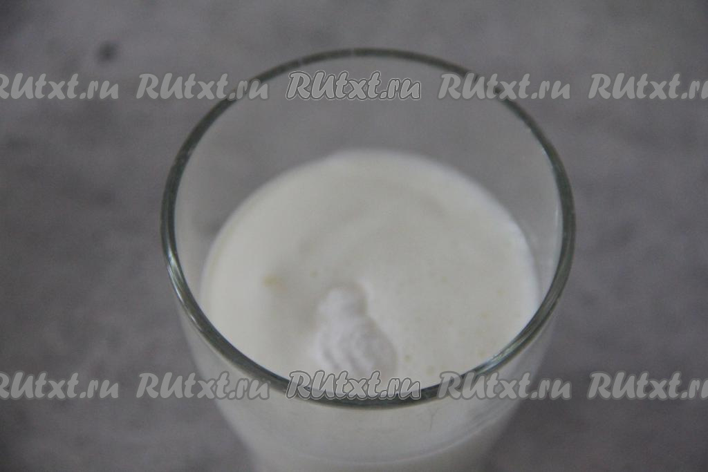 В отдельную ёмкость налить кефир, добавить соду, хорошо перемешать и дать постоять минут 5. За это время сода погасится в кефире, а поверхность кефира запенится.